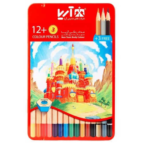 مداد رنگی آریا ۳+۱۲ رنگ جعبه فلزی